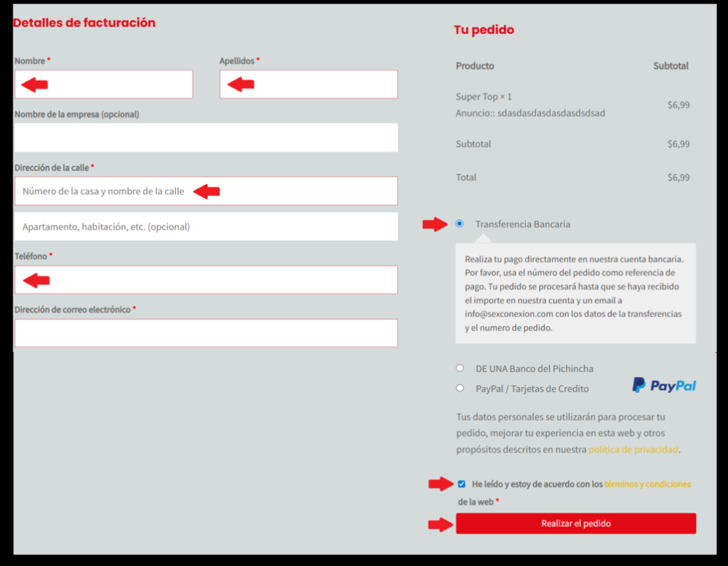 Completa los datos de facturación/envío del comprobante (los campos con * son obligatorios).