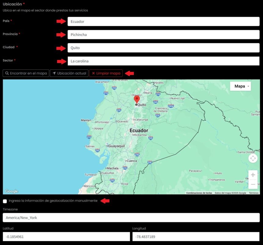 Avanzado: puedes ingresar latitud y longitud manualmente.