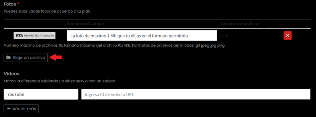 Formatos: .gif, .jpeg, .jpg, .png | Máx: 1 MB por archivo.