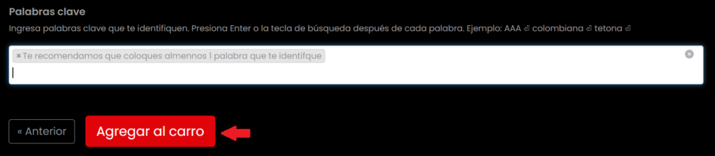 Tags: añade palabras clave para facilitar las búsquedas y da clic en Agregar al carro