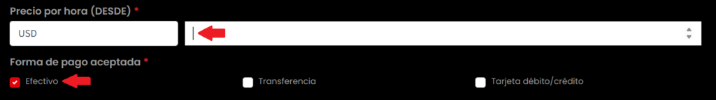 Precio por hora y métodos de pago aceptados (Obligatorios).