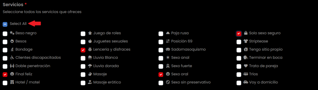 Servicios: marca los que ofreces; extras en la descripción.